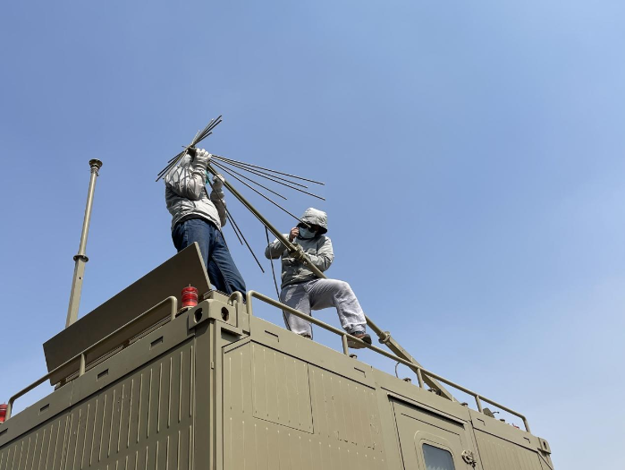 在非洲的沙漠大地上,电科莱斯某海外项目团队成员为了做好用户设备维护,在室外温度40℃、设备舱顶50℃的高温环境下开展作业。迎高温、赶任务、保交付,他们在海外诠释中国电科人的勇气、责任与担当。